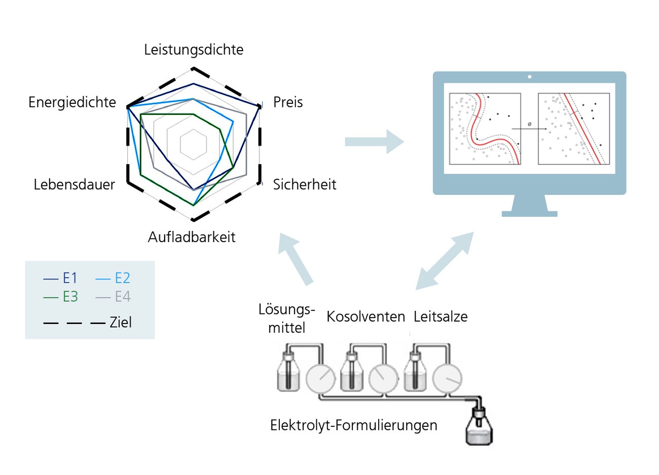 The KI-LECTROLYTE project follows a data- and model-driven approach to discover new electrolyte formulations. The project partners are developing simulation and prediction models to identify electrolyte properties more efficiently. At the heart of the project lies a central electrolyte database that combines experimental data, simulated results, and AI-generated predictions of key material properties. This consolidated database provides high-quality, curated data that support the targeted planning and evaluation of experiments and simulations. The database can be searched specifically for various battery chemistries, such as lithium-ion, sodium-ion, or lithium-sulfur batteries. Using this resource, AI-assisted models can accurately predict electrolyte behavior and propose new formulations to optimize existing systems and explore entirely new chemical concepts. By doing so, KI-LECTROLYTE closes an important gap in electrolyte materials research, since structured and comprehensive databases dedicated to electrolytes are still largely missing.