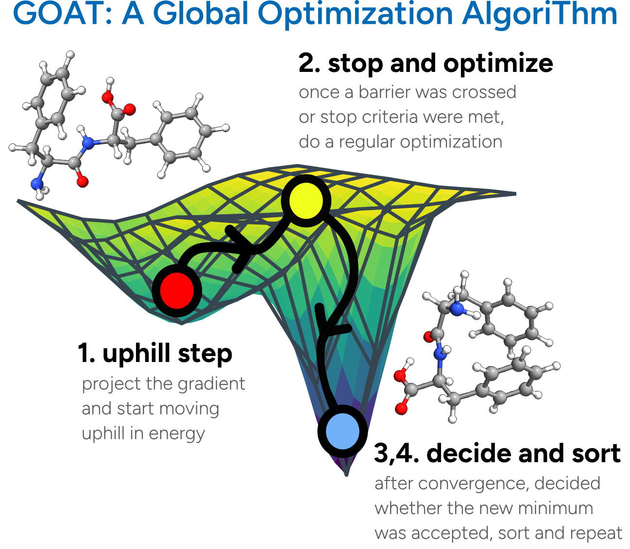 GOAT is a global optimization algorithm for molecules and atomic clusters implemented in ORCA. It can be used for automated conformer ensemble generation, reaction exploration and more. GOAT can be combined with a variety of electronic structure methods implemented in the ORCA quantum chemistry software package. These include semi-empirical methods like GFN-xTB or DFT.